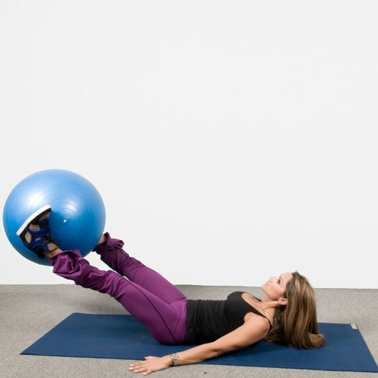 Ξάπλωσε στο στρωματάκι και στήριξε την μπάλα ανάμεσα στους αστραγάλους. Ανασήκωσε τα πόδια τεντωμένα περίπιου 45o. Ανασήκωσε παράλληλα ελαφρά το πάνω μέρος του σώματος και φρόντισε τα χέρια σου να είναι ανοικτά στην ευθεία της λεκάνης για να διατηρείς την ισορροπία σου.